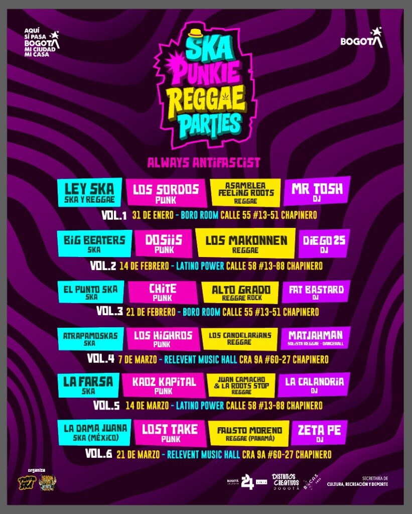 Con seis fechas, más de veinte proyectos en tarima, más de 100 artistas músicos en tarima y una apuesta clara por la circulación real e independiente, el Ska Punkie Reggae Parties 2026 se consolida como uno de los circuitos más importantes del primer semestre del año en Bogotá.